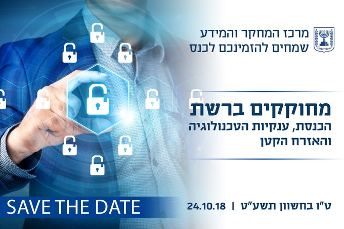 מי שומר על המידע האישי שלנו? בואו לשמוע את המחוקקים, הרגולטורים, החוקרים, המשפטנים ואנשי אקדמיה, בכנס בכנסת "מחוקקים ברשת – הכנסת, ענקיות הטכנולוגיה והאזרח הקטן" של מרכז המחקר והמידע ותחום חקיקה ומחקר משפטי בלשכה המשפטית של הכנסת. >> שריינו את התאריך >> 24.10.2018 פרטים בהמשך. https://t.co/tIvUP4ChCL